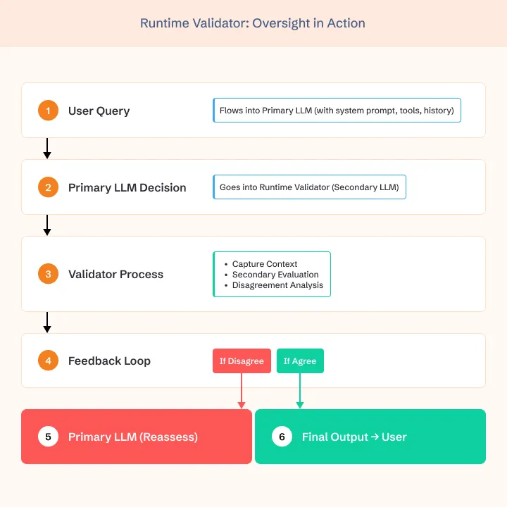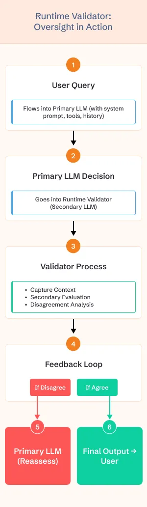 That’s where the Runtime Validator comes in. It acts as a real-time evaluator of the primary LLM’s decisions.