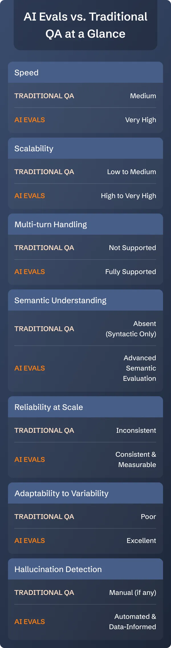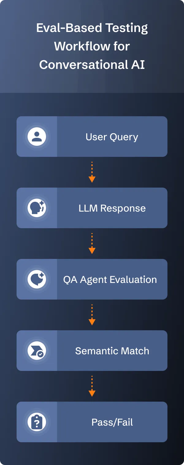 This nondeterminism is why traditional QA scripts fail and AI-native evals are necessary. Evals account for multiple valid flows and contextual behavior, rather than rigid one-to-one mappings.