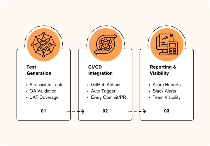 Tests are wired into GitHub Actions, running automatically on every code change. No manual steps. No waiting.