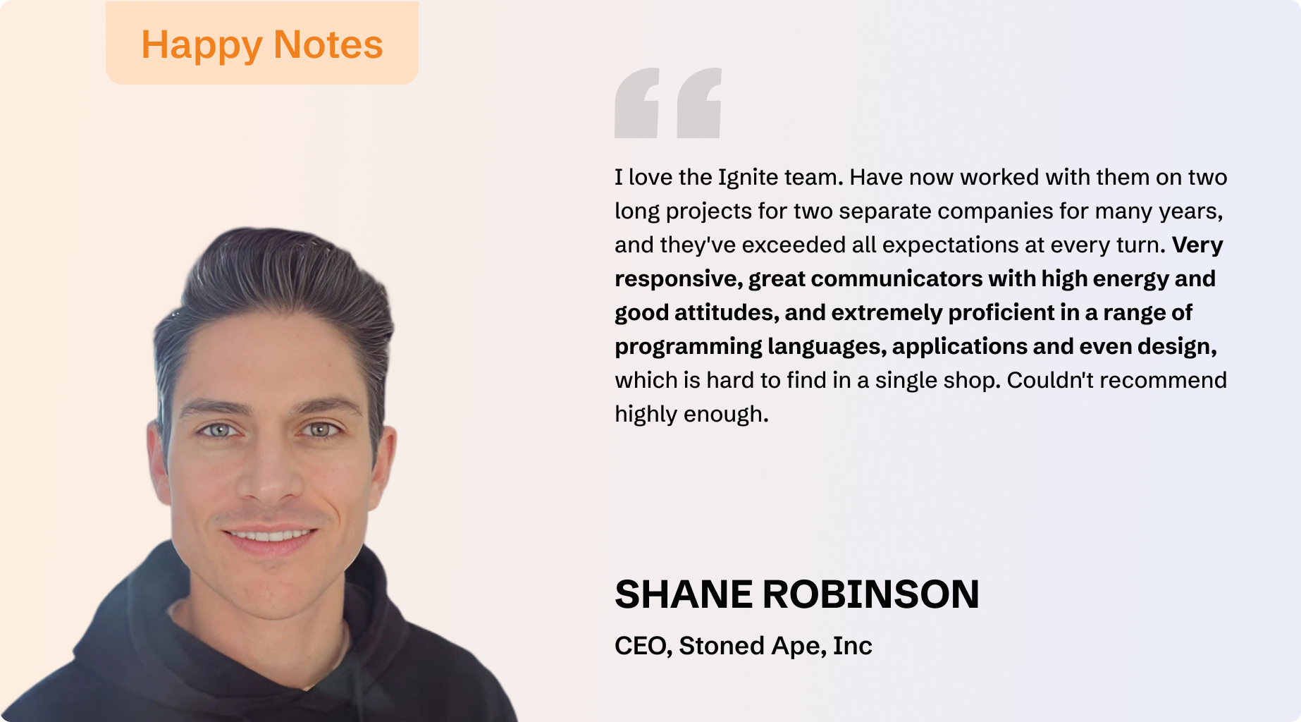 I love the Ignite team. Have now worked with them on two long projects for two separate companies for many years, and they’ve exceeded all expectations at every turn. Very responsive, great communicators with high energy and good attitudes, and extremely proficient in a range of programming languages, applications and even design, which is hard to find in a single shop. Couldn’t recommend highly enough.