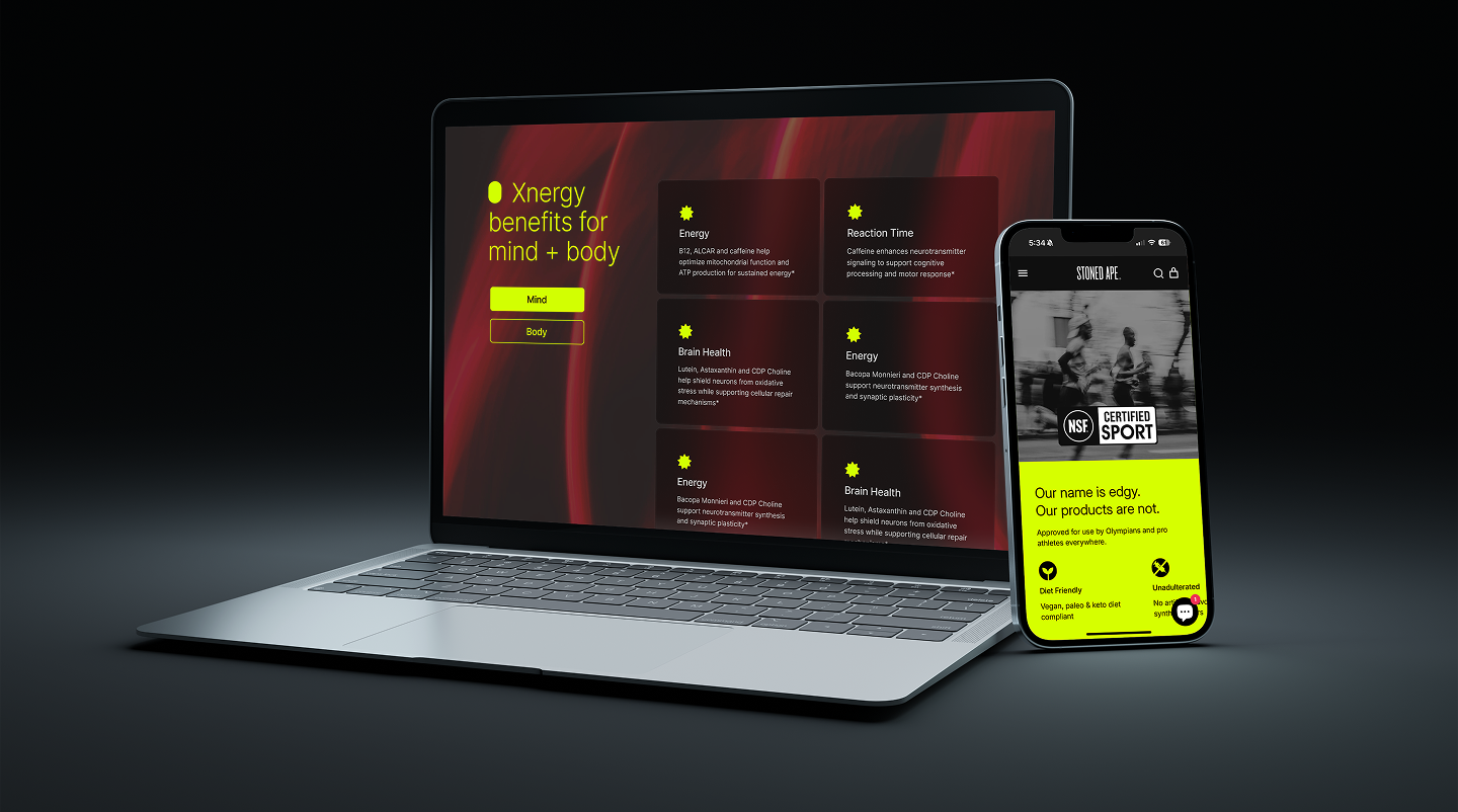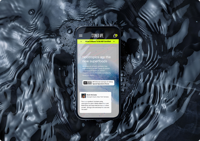 How do you design a feeling? Cognitive clarity, focus, and resilience aren’t visual elements. But using motion graphics, heatmap imagery, blur trails, and abstract animations, the team created a mood that mirrored the effects of each product. The design reflects Stoned Ape’s audience, precise, confident, and full of energy, with every detail created to match their discipline.